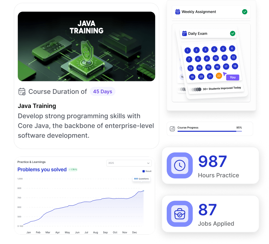This Java course runs for 30 days, offering intensive and hands-on core Java training. The short duration ensures fast-tracked learning without compromising on essential concepts.
