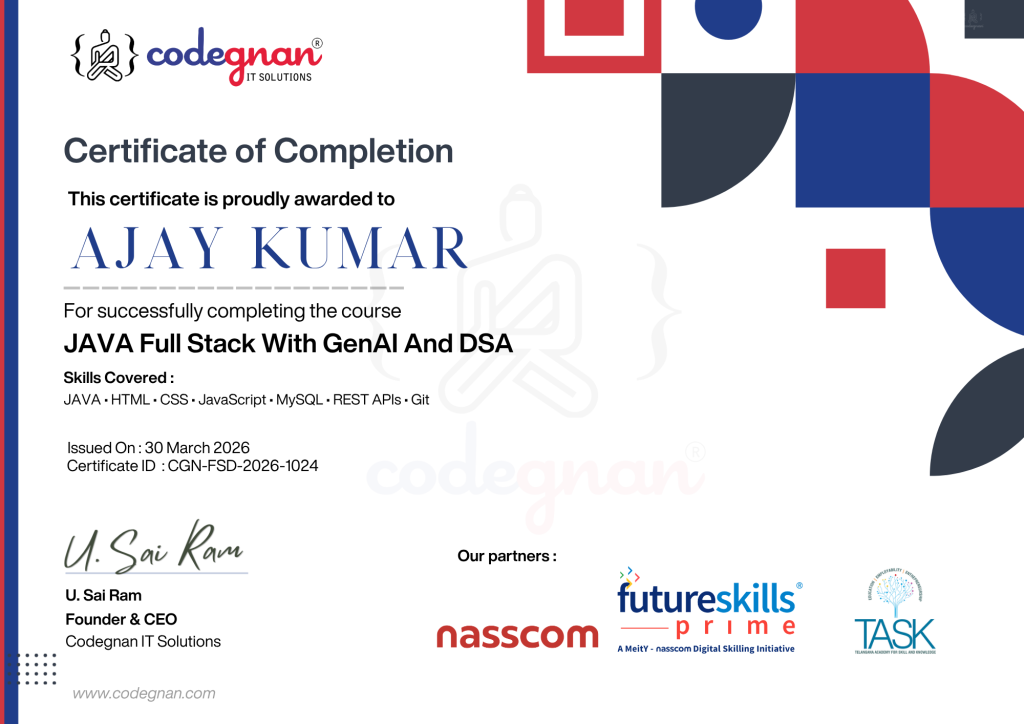 Codegnan offers a Java Integrated Java Full Stack with DSA and Generative AI Course program for 3-4 months. It is a job-oriented professional course that provides strong knowledge and a proper understanding of Java technology. We provide extensive training in all the relevant disciplines to enable engineers to develop Java-based applications that meet industry standards. We also offer Java programming language training along with OCJP certifications.